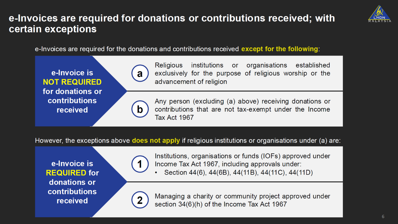 * Tax-exempt religious bodies (e.g., those that issue tax-deductible receipts under Section 44(6) etc) must comply with e-Invoice rules for such transactions.